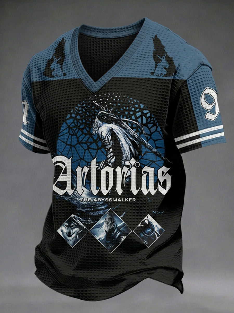 Herren T-Shirt in dunklem Stil mit Totenkopf-Print, V-Ausschnitt und Waffelstruktur